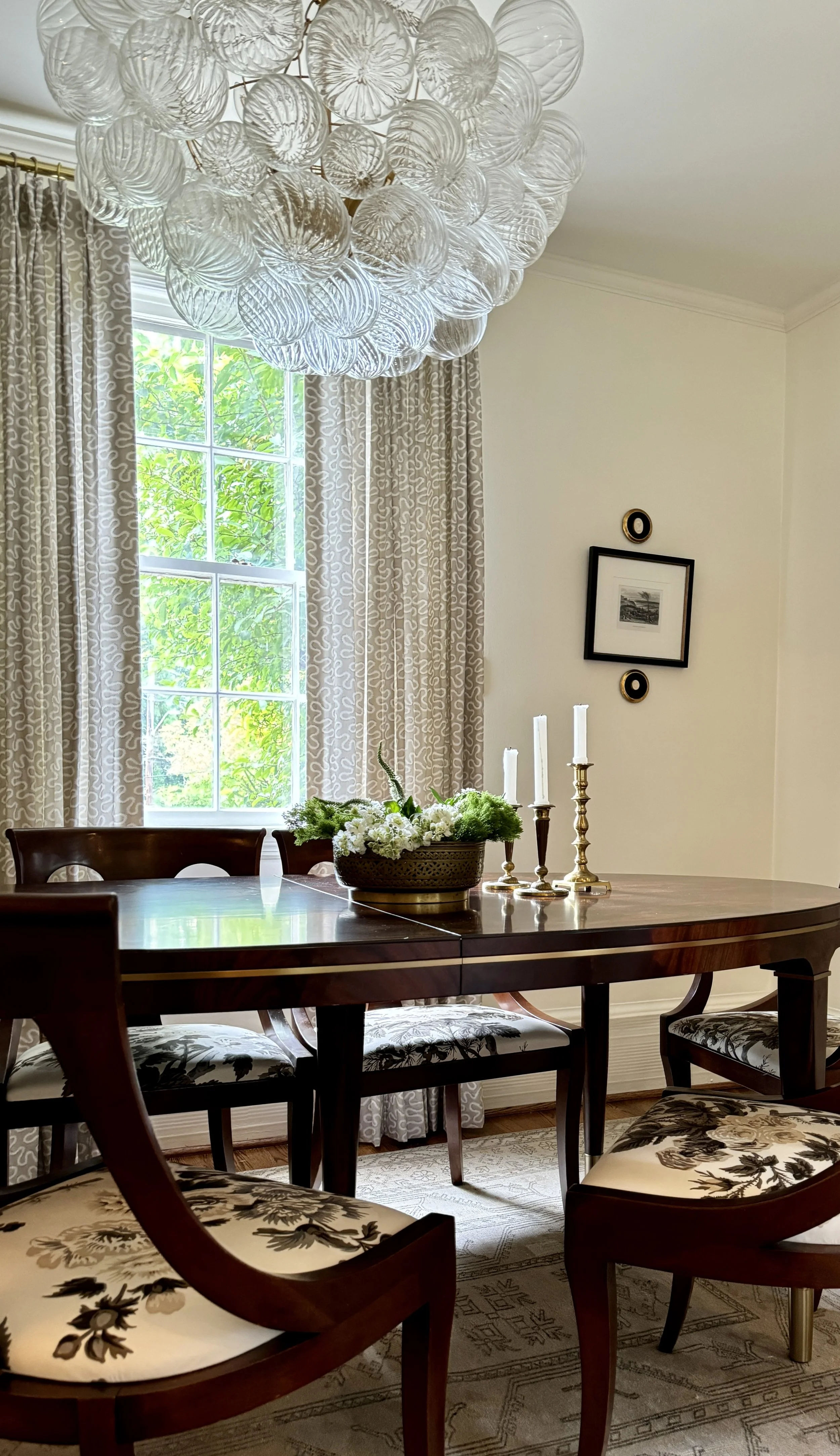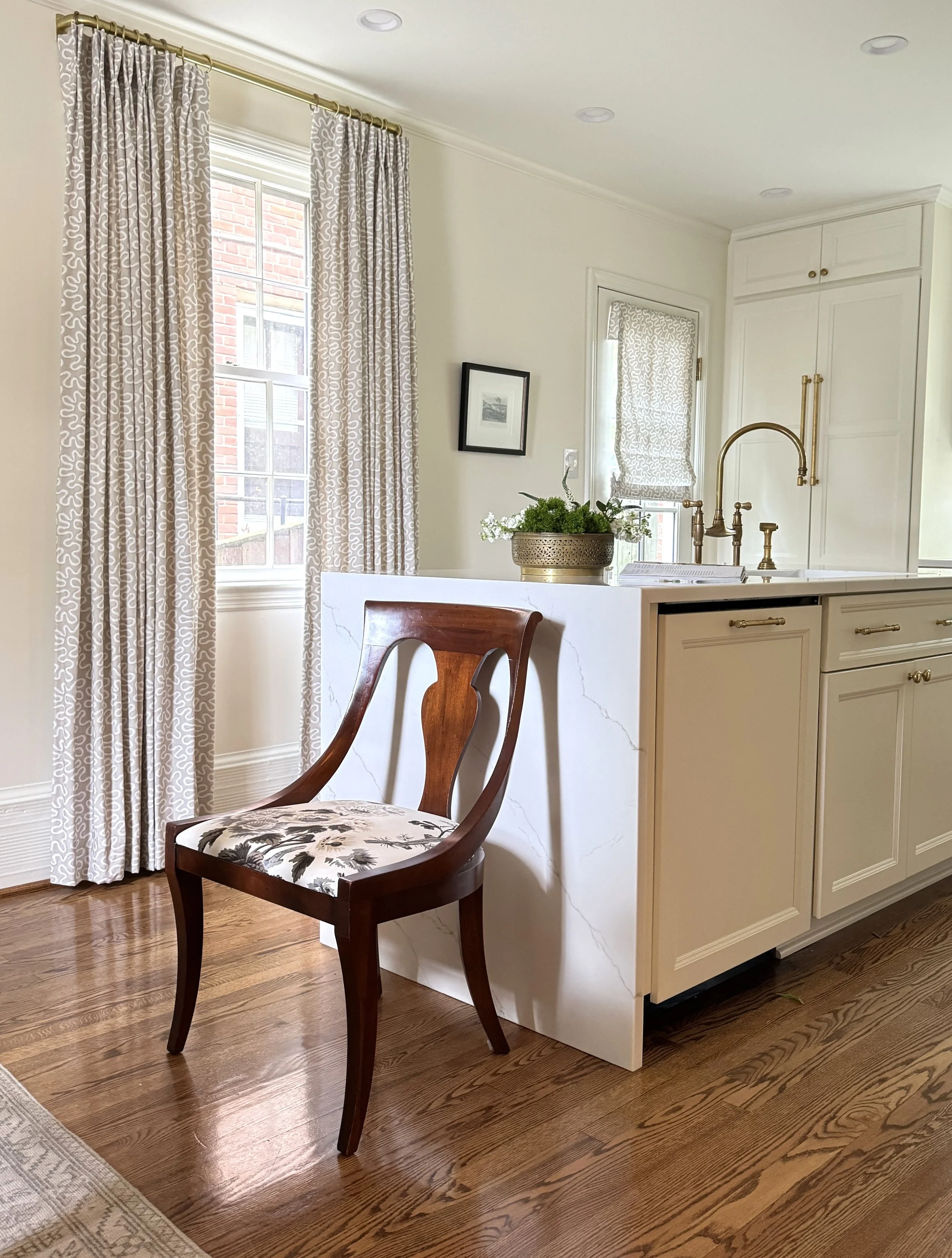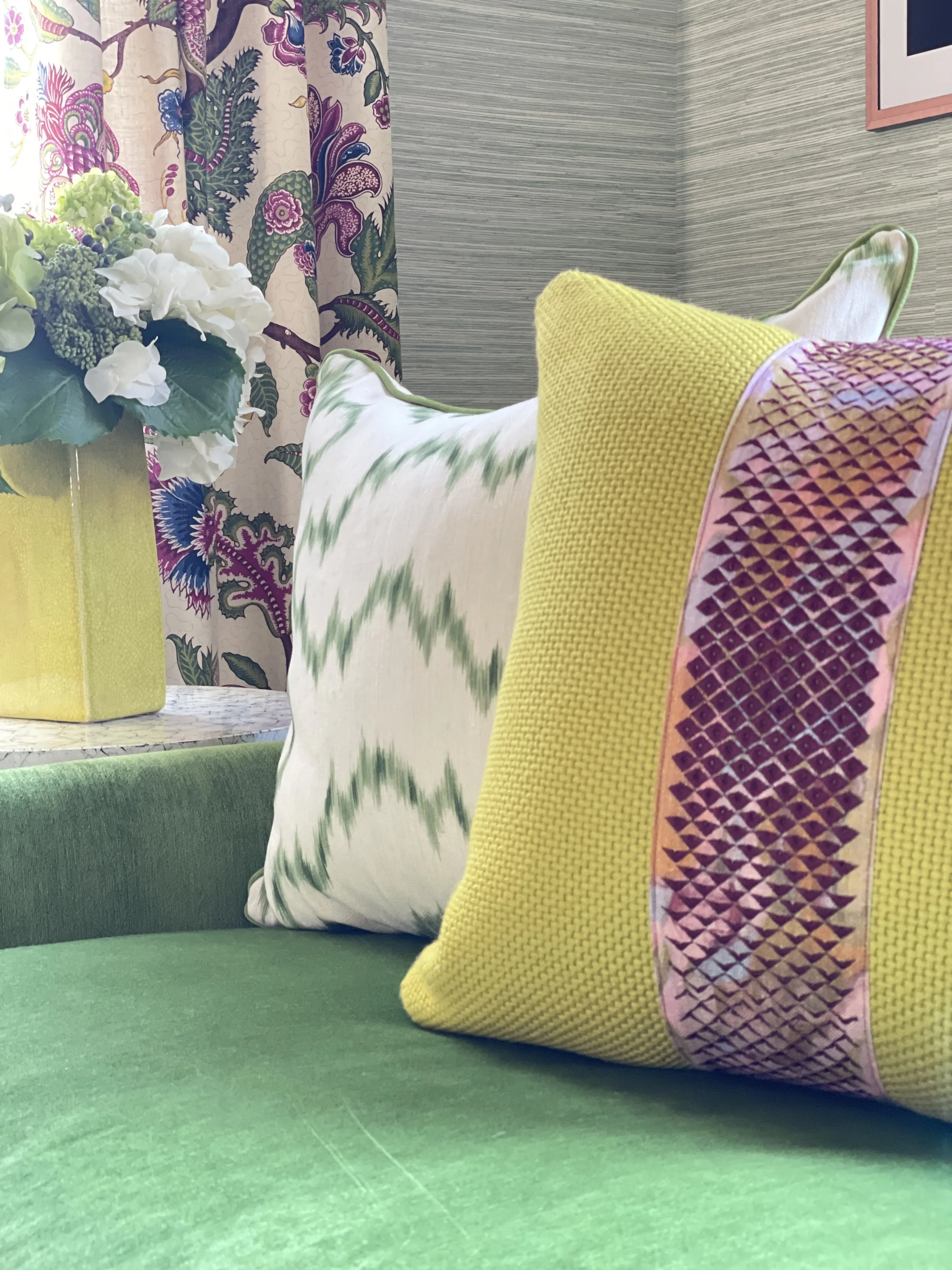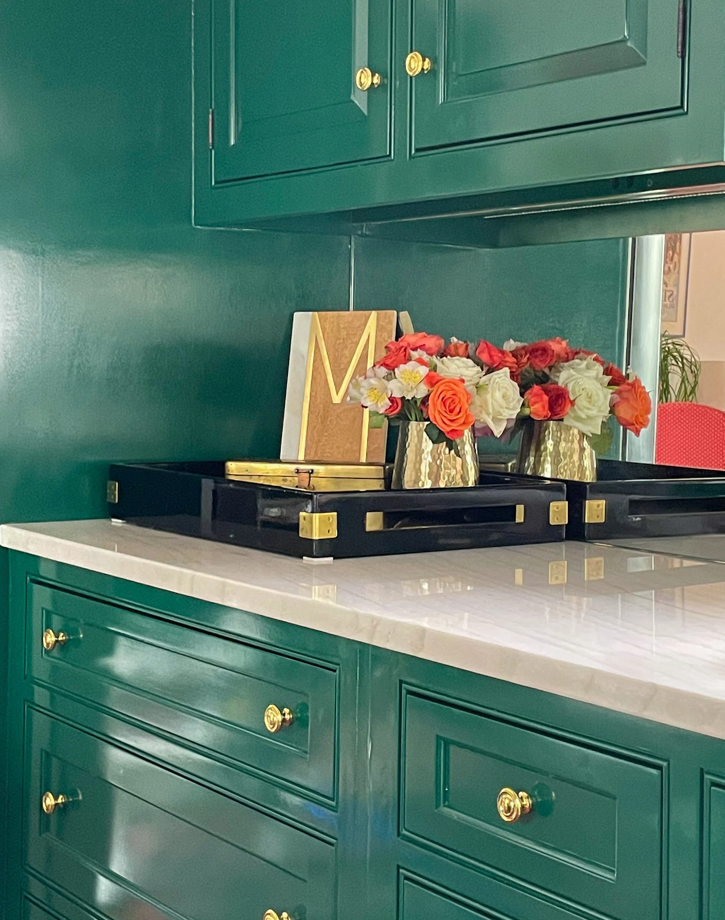 Decorative kitchen countertop with green cabinets, gold handles, a black tray, pink and white flowers in gold vases, and a letter M on a corkboard.