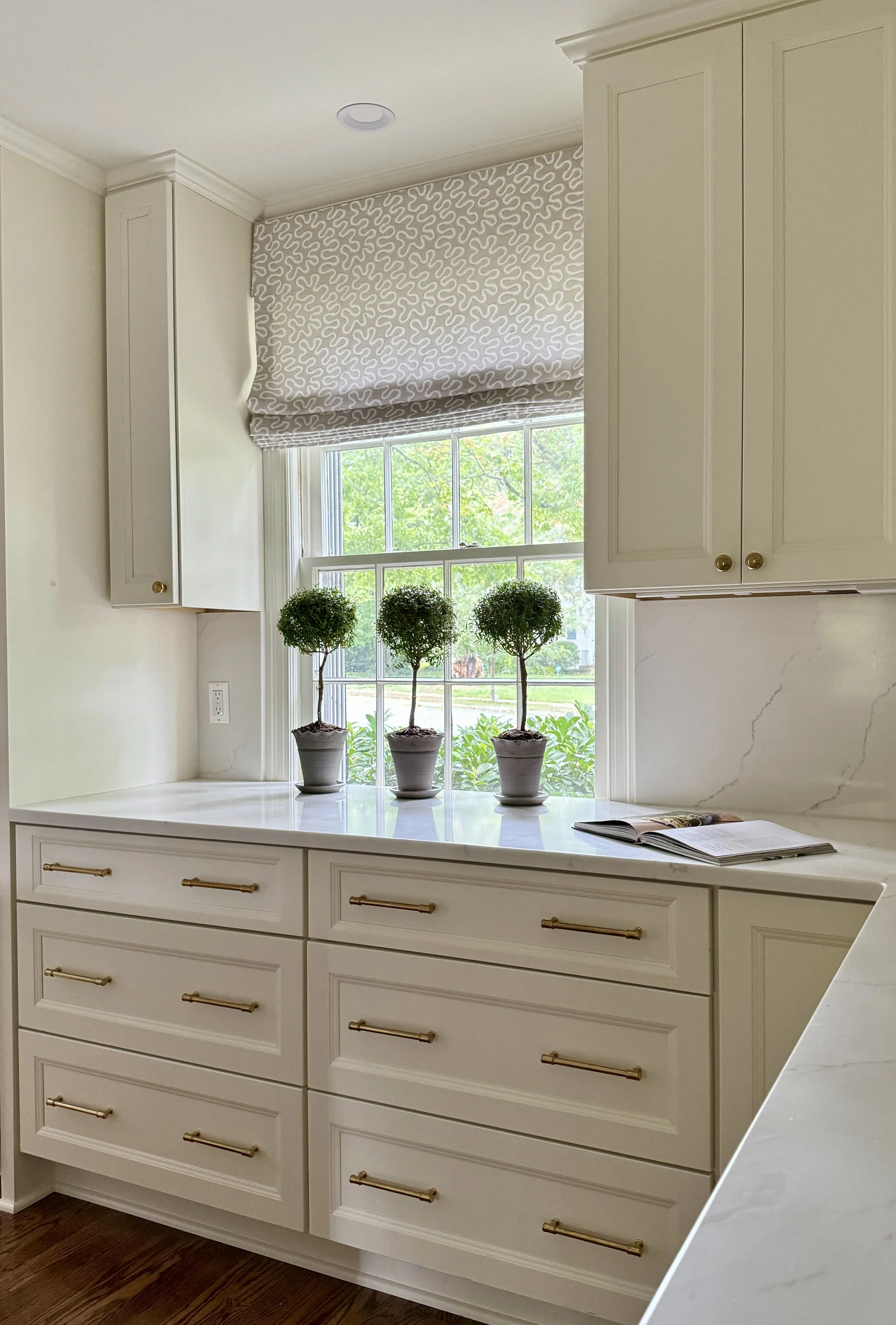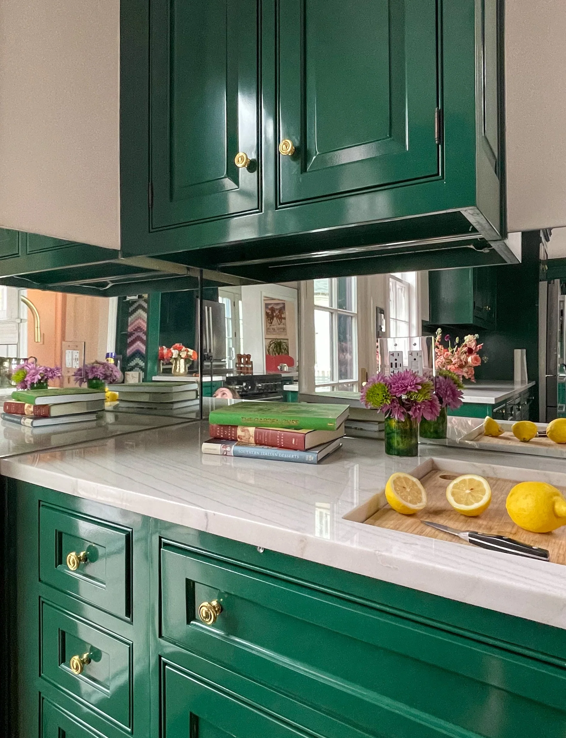 A kitchen counter with green cabinets, a white marble countertop, open books, pink flowers in vases, a cutting board with lemons, and a knife.